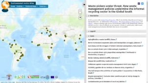 The map is a selection from the Environmental Justice Atlas of 50 conflicts in Africa, Asia and Latin America in which waste pickers are fighting for social and environmental justice. The map makes it easy to see who loses and who benefits from policy shifts.