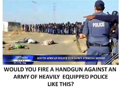 South African police ordered thousands of striking platinum mineworkers off a hill more than a kilometer away from Lonmin property. As they left the hill, which the police surrounded with barbed wire, 34 were killed and 78 injured. No police were hurt in the operation. Most were killed while trying to escape. 270 were arrested and state prosecutors charged them with the ‘murder’ of their colleagues (under an obscure apartheid-era doctrine of collective responsibility).