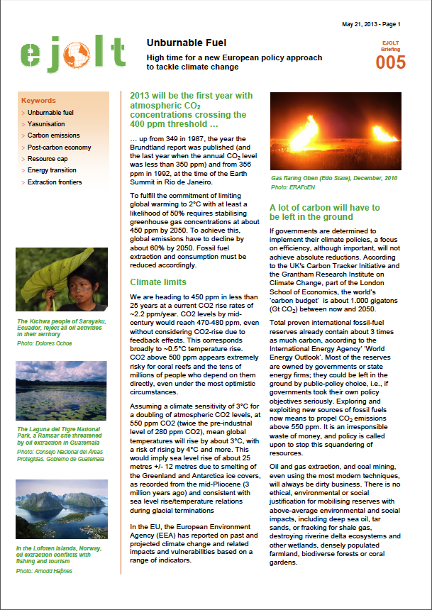 Total proven international fossil-fuel reserves already contain about 3 times as much carbon as what we can burn and still have a reasonable chance to stay below the internationally agreed 2°C target. That’s why there is no ethical, environmental or social justification for mobilising reserves with above-average environmental and social impacts, including deep sea oil, tar sands, or fracking for shale gas, destroying riverine delta ecosystems and other wetlands, densely populated farmland, biodiverse forests or coral gardens.