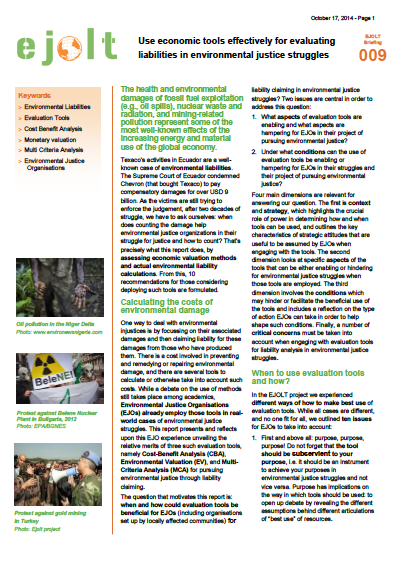 Schermafbeelding 2014-10-20 om 09.35.03An international team of academics and activists collaborated to find out what works where, based on the wide variety of experiences with economic valuation in the EJOLTproject. The outcomes suggest that they help when they support existing debates on local futures and visions and when there are complementarities with regulatory and institutional developments. Oppositely, evaluation methods disable local mobilization when they force communities to bring their concerns into assessment schemes that do not fit their own languages and concerns, when they reproduce uneven power relations, or where public decisions have little to do with formulating and advancing ‘reasoned arguments’. Beatriz Rodriguez from the Autonomous University of Barcelona (UAB) and author of the report said: “Evaluation tools can be used to ‘deconstruct alibis’ for perpetrating environmental injustice, specifically the alibi of ‘sound economic sense’ that is regularly put forth by promoters of projects harmful to the environment and communities”