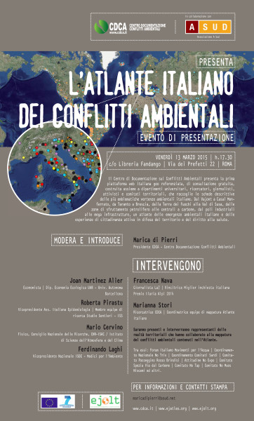The Documentation Centre of Environmental Conflicts, in Rome since 2007, is pleased to invite you to the presentation of the first Italian open georeferenced Web Platform built by a interdisciplinary team composed of researchers, journalists, activists and territorial committees. It gathers information on the major Environmental conflicts in Italy. From Vajont to Casal Monferrato, from Taranto to Brescia, from the “Terra dei Fuochi” to Susa Valley, from the oil exploitation area to the coal-fired power plants, from Industrial districts to agroindustry areas, from the mega-infrastructures to waste management. The Atlas of the Italian environmental emergencies also gathers the experiences of active citizenship in defence of local territories and right to health.