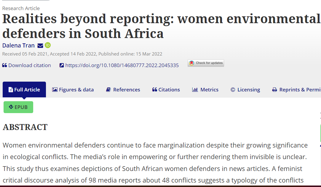 Read now the new research article of Dalena Tran about women environmental defenders in South Africa.