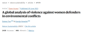 Women environmental defenders face retaliation for mobilizing against extractive and polluting projects, which perpetrate violence against Indigenous, minority, poor and rural communities. The issue matters because it highlights the gendered nature of extractive violence and the urgent need to address the systemic patterns of violence that affect women defenders, who are often overlooked and underreported. Here we analyse violence against women defenders in environmental conflicts around the world. We use data from the Environmental Justice Atlas and employ log-linear and binomial regressions to find statistically significant patterns in displacement, repression, criminalization, violent targeting and assassinations committed against women defenders in extractive conflicts. Statistical results indicate that violence against women defenders is concentrated among mining, agribusiness and industrial conflicts in the geographical South. Repression, criminalization and violent targeting are closely linked, while displacement and assassination appear as extreme outcomes when conflict violence worsens. Women defenders experience high rates of violence regardless of countries’ governance accountability and gender equality. This work contributes to the broader sustainability agenda by highlighting the need to address the impacts of extractive activities on women.