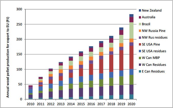 At present, most of the wood Europe burns for energy purposes comes from Europe itself and from Northern America, especially from the South of the USA. But increasingly, projects are being implemented in the global South by corporate actors for the aforementioned attractive reasons. See the rise of Brazil in the EU’s demand for pellets:
