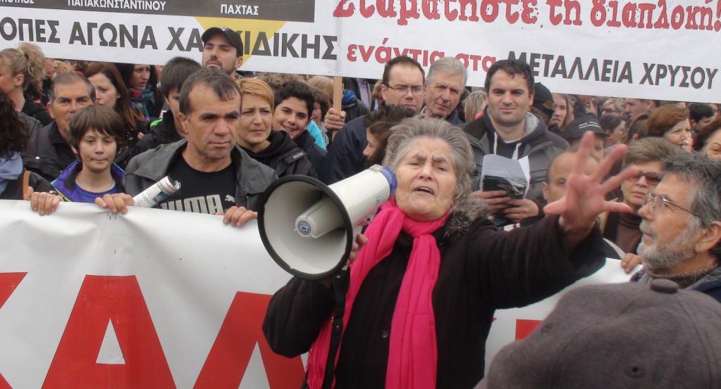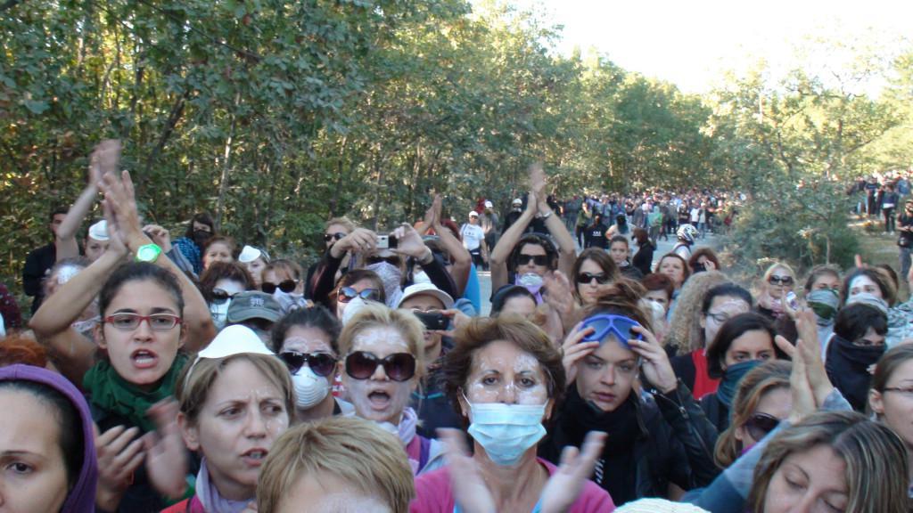 In October 2012, a demonstration goes through the forests of Skouries, where the large open mine would come. Videos on YouTube show how the riot police attack women in the front rows and then chases them, for seven kilometers. The agents of the Halkidiki region are not afraid to beat up a sixty year old women. The police follows-up by suing sixteen protesters for “resisting the authorities and attempts to inflict bodily harm to the police.” Amnesty International follows up with case for human rights violations by the Greek State forces against unarmed, nonviolent citizens.